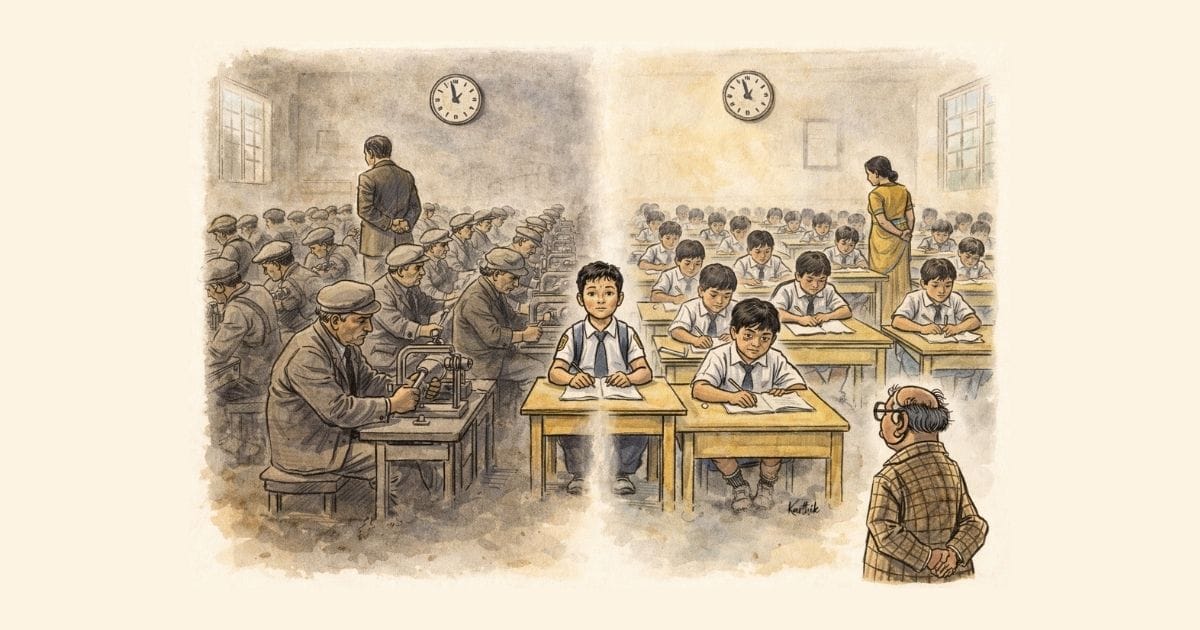 The school was built to produce exactly that. And three design assumptions from that era are still sitting, largely unchanged, in the school your child attends today.